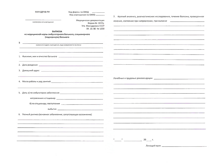 Купить выписку из истории болезни (форма 027/у) в МосквеСерьёзное заболевание или травма, требующие длительного лечения и реабилитации, неприятны не только физическими страданиями и риском осложнений. Они неизбежно ведут к хлопотам по месту работы или учёбы. И если в средней школе на долгое отсутствие ученика по болезни педагоги смотрят сквозь пальцы, то уже в институте, а тем более на месте постоянного трудоустройства к вынужденному прогульщику приковано внимание администрации. С него почти наверняка будет истребована форма 027у – краткая выписка из истории болезни. В отличие от полной медицинской карты, документ под кодом 027 не составляет врачебной тайны и предназначен для выдачи пациенту на руки. В зависимости от типа лечения существует два типа справки 027 – амбулаторная и стационарная. Первая оформляется после прохождения курса лечения на дому с наблюдением в поликлинике. Стационарная форма 027у выдаётся пациентам медицинских учреждений, в котором больной находился на стационарном лечении, а также пациентам реабилитационных центров, санаториев, курортов, где человек длительное время лечился и восстанавливался после болезни. Выписка 027 заполняется лечащим врачом больного, содержит основные сведения о перенесенном заболевании, его этапах, примененных курсах лечения, реабилитационных мероприятиях, выданных больному рекомендациях. Также в справке 027 могут быть указаны условия труда, допустимые для данного пациента после болезни. Документ является бланком строгой отчётности с уникальным номером, заверяется личной подписью руководителя медицинского учреждения и его печатью. Зачем нужна форма 027Справка 027 нужна в следующих случаях: